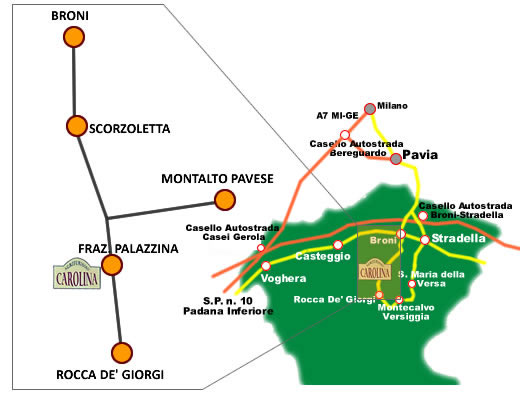 Da OPERA, prendere la superstrada, passare Pieve Emanuele e Melegnano. Uscire a LANDRIANO - PAVIA. Proseguire per Pavia e poi per STRADELLA - BRONI. Arrivati a BRONI, alla prima rotonda girare a destra, direzione CASTEGGIO. Al semaforo e alla seconda rotonda proseguire diritto. Arrivati al semaforo successivo, girare a sinistra in via Eseguiti, seguendo i cartelli per Rocca de'Giorgi. Arrivati in fondo alla strada, girare a destra e proseguire per circa 6 km sino alla Località Palazzina, senza mai lasciare la strada principale.